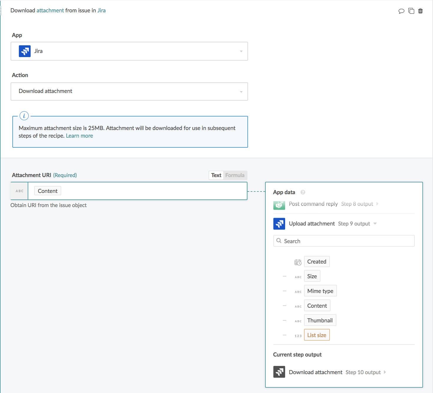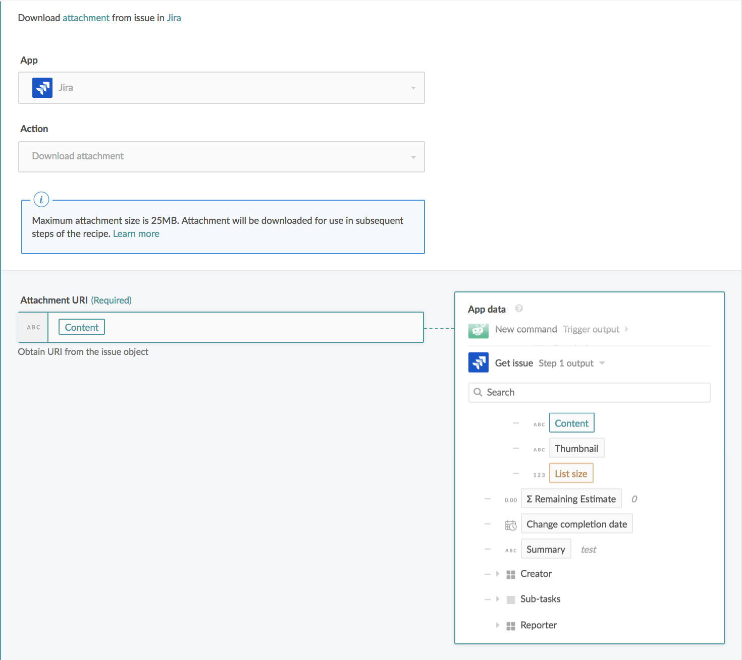 Content Link to the attachment itself. Can be used in proceeding action steps that support attachments, for example, the Attachment URI field from the Download attachment action.
