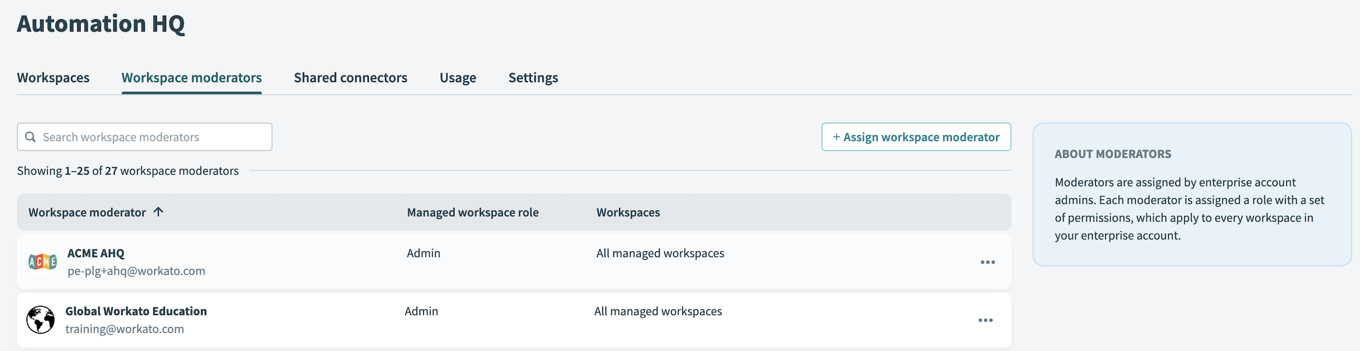 管理されたワークスペースの設定を支援するために、ワークスペースモデレーターを割り当てることができます。ワークスペースモデレーターは、組織内のすべてのワークスペースにアクセスできます。