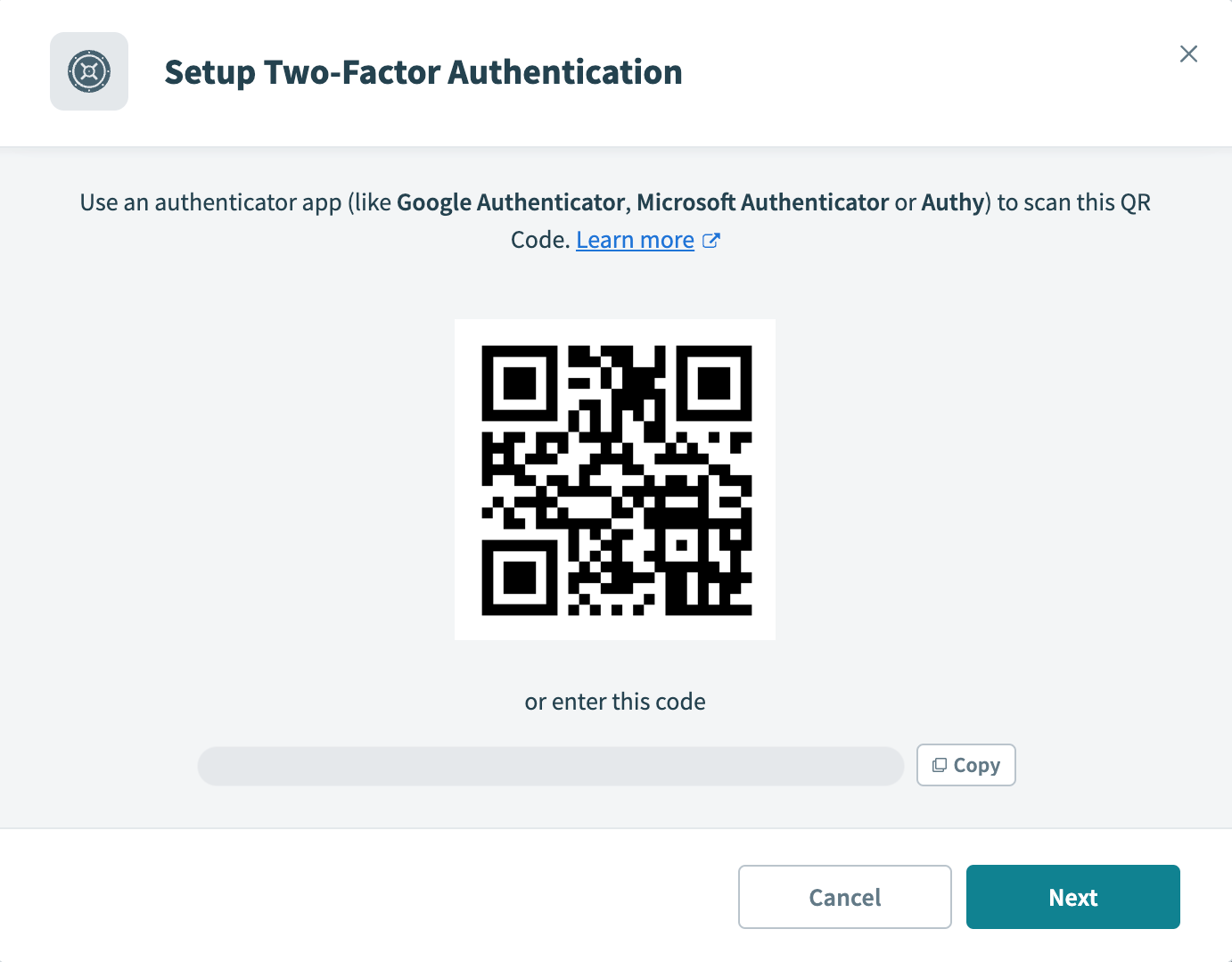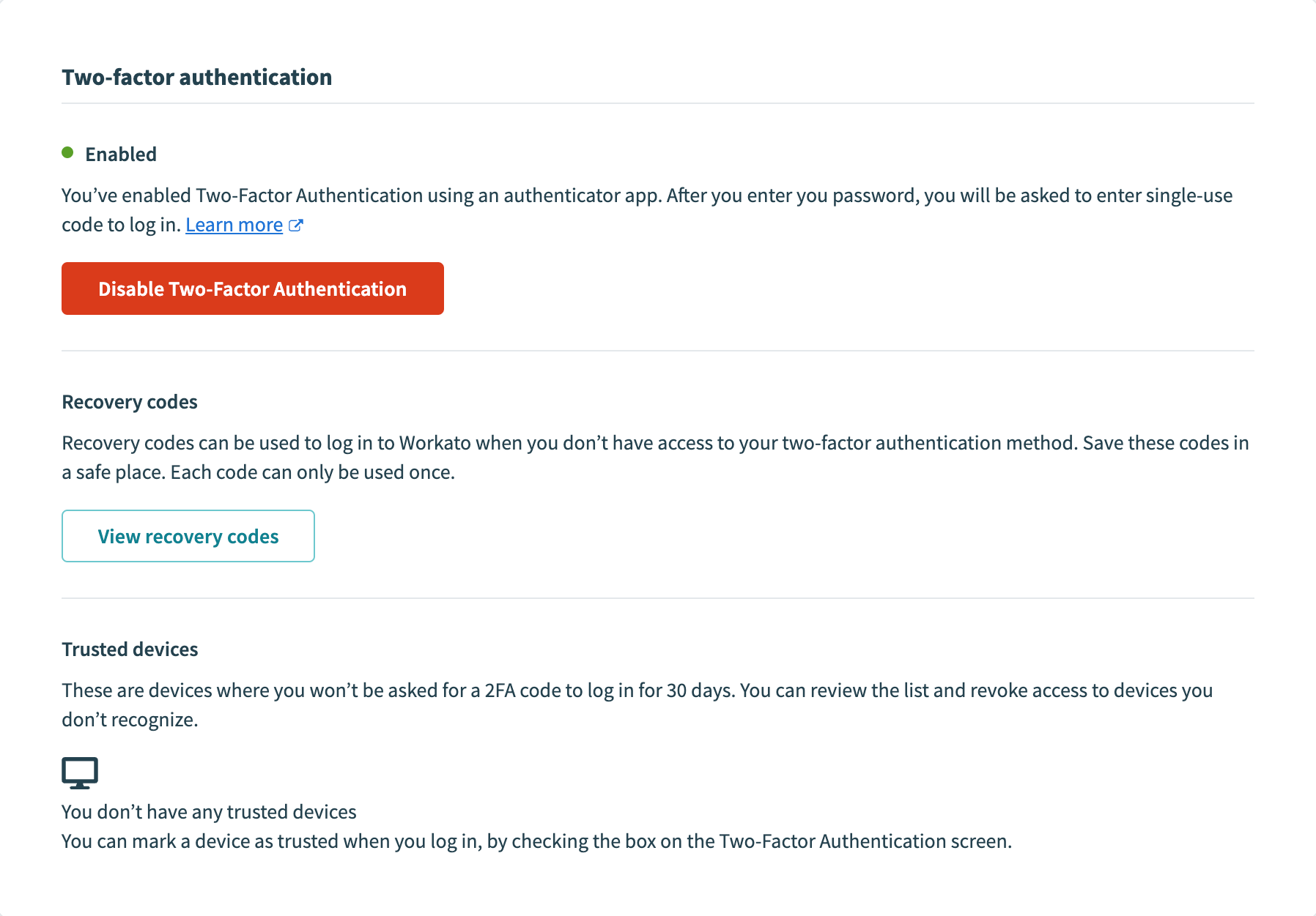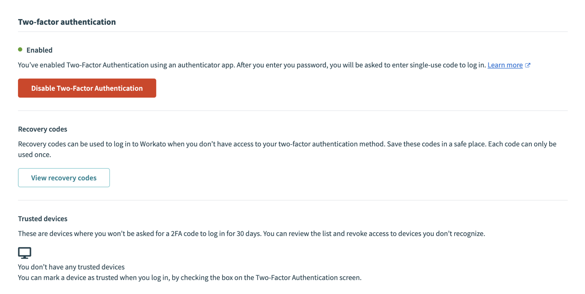 アプリを削除したり、デバイス (またはセキュリティキー) を変更または紛失したりした場合でも、Workato のアカウントにアクセスできます。回復コードを使用すれば、2要素認証が可能です。