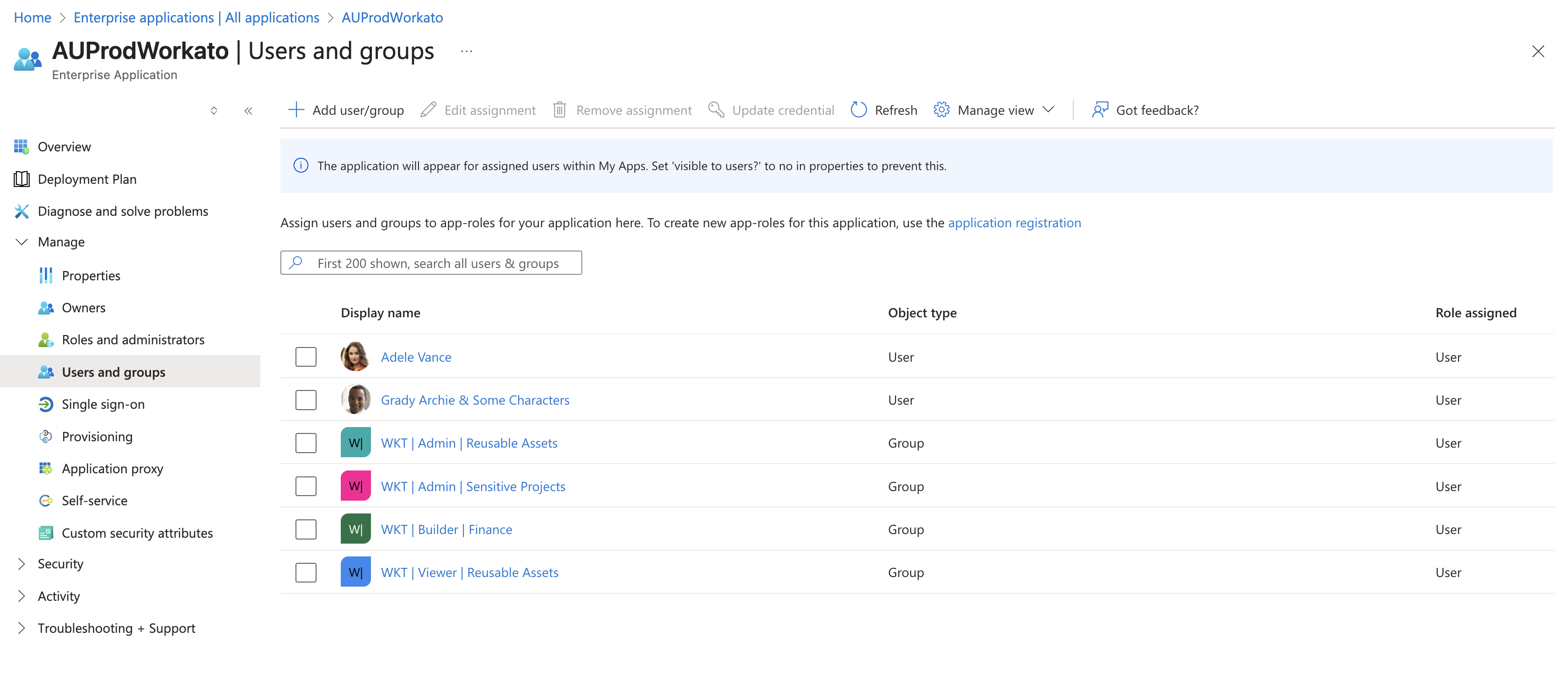 Go to Enterprise Applications > Workato > Users and groups in Microsoft Entra ID.
