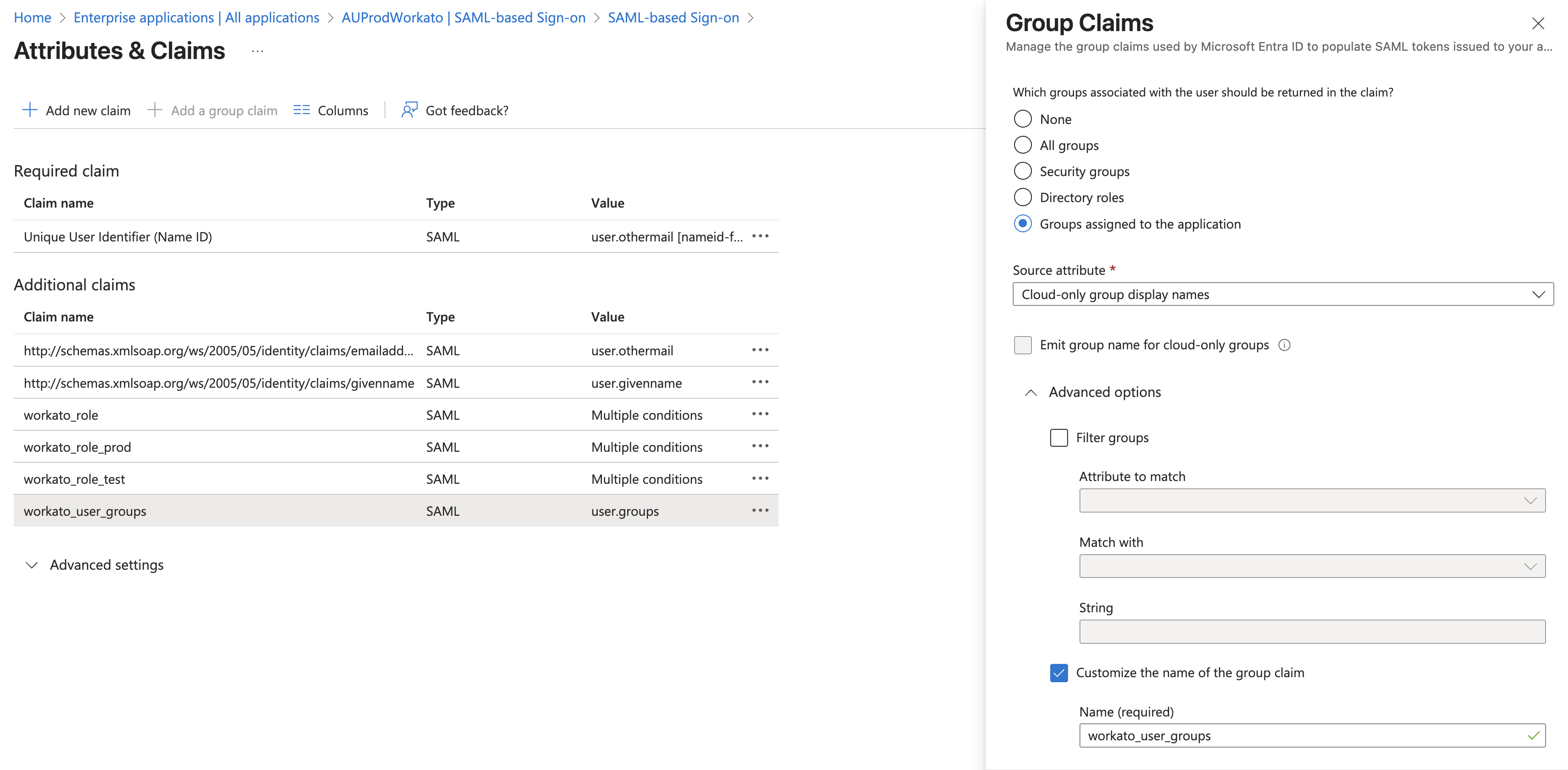 You can define a group claim that passes these display names in the workato_user_groups attribute. Any user assigned to those Entra groups automatically passes the corresponding collaborator group values to Workato during SAML SSO: