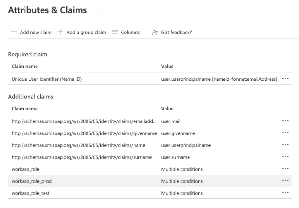 Go to Enterprise Applications > Workato > Single Sign On > Attributes & Claims > + Add a new claim in Microsoft Entra ID.