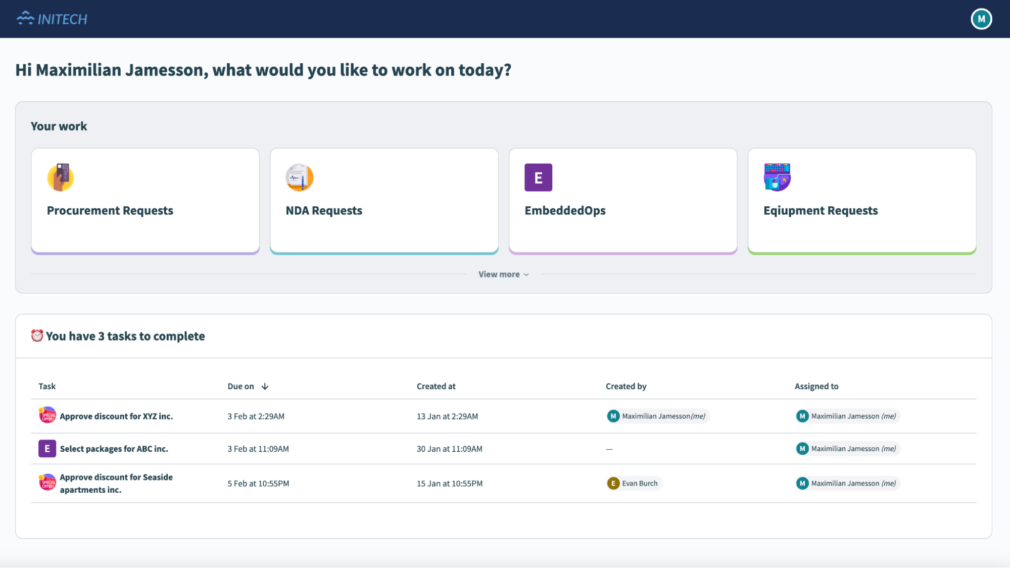 Additionally, the page contains an inbox. The inbox includes all of the tasks assigned to the app-user. This includes both tasks assigned to the app-user directly and tasks assigned to groups they belong to. Click the task to navigate to the task page.
